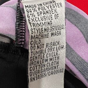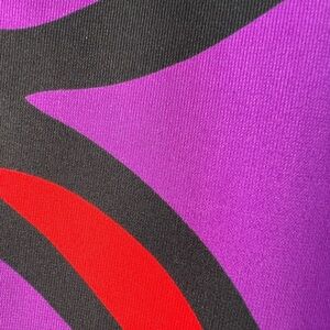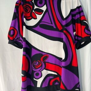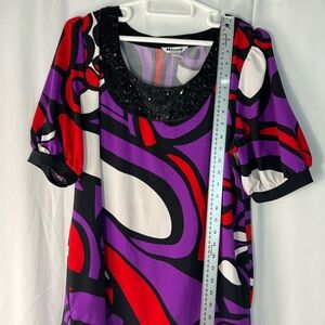 Make a bold statement with this Nygard Collection women’s blouse featuring an eye-catching abstract floral pattern in purple, red, black, and white. The design is complemented by a beautifully embellished black beaded scoop neckline and short puff sleeves with elastic cuffs. Crafted from a soft, stretchy blend of 94% polyester and 6% spandex for a comfortable, flattering fit. Perfect for both dressy and casual occasions.