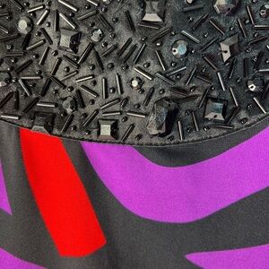 Make a bold statement with this Nygard Collection women’s blouse featuring an eye-catching abstract floral pattern in purple, red, black, and white. The design is complemented by a beautifully embellished black beaded scoop neckline and short puff sleeves with elastic cuffs. Crafted from a soft, stretchy blend of 94% polyester and 6% spandex for a comfortable, flattering fit. Perfect for both dressy and casual occasions.