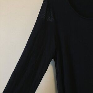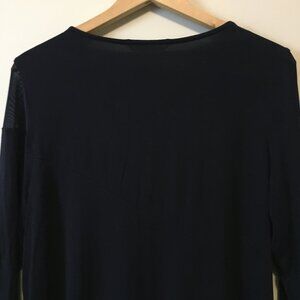 Very good preowned condition dark, dark navy blue dress/almost black, wrap over dress by Nygard. The bottom is the wrap over part and the shoulders sport a fine mesh/net insert. So sleek and elegant. And made of sustainable rayon as well. It can be worn as a mini tunic dress or shirt. Would be short for a dress and ideally worn with thicker tights.