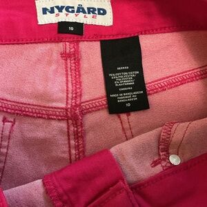 Pink jeans. I think mid rise, bit of stretch. Add a pop of colour to your wardrobe. Two back pockets. Pull on.