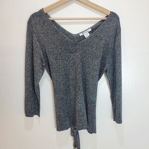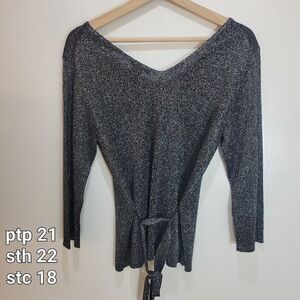Lovely silver gray sparkly sweater with 3/4 length sleeves and an optional waist belt from Nygard. Not itchy and scratchy like some other sparkly sweaters, this nygard one has a nice soft slinkyness to it. Excellent preloved condition no stains or tears or pil. The cinch belt can be removed by simply pulling it out of the small belt loops either side of the waist. Elegant wide v neckline.