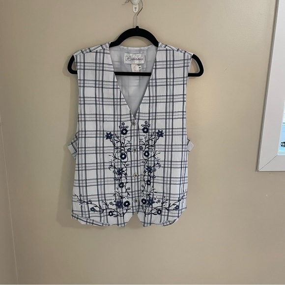 Nyguard Collection Embroidered Button Down White/Navy Tie Strap Back Vest, In like new condition,