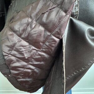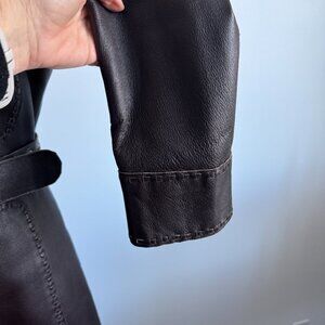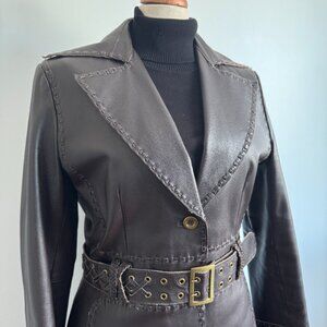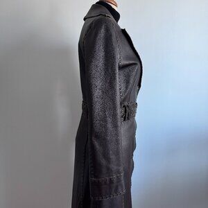 Nylon by Dex - Long Brown Leather Coat with Belt - Pointed Collar - Lined - Button closure - Fitted - Excellent pre-owned condition - Like New