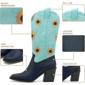 Unique Desigh Elevate your style with nzzoo women's cowboy boots, featuring exquisite sunflower embroidery and a stylish square-toe design for a chic western look.
