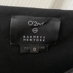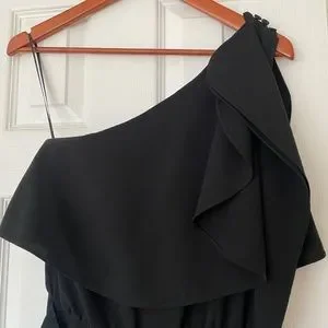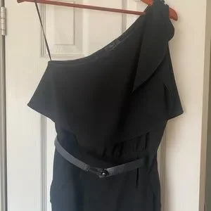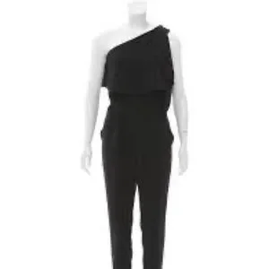 O’2ND black, one-shoulder jumpsuit. Exclusive for Barney’s New York. Ruffled overlay on shoulder, bodice and dual-slit pockets. Elasticized waist with removable (great!) belt. Buttoned closures on shoulder. Cropped ankle with zip accents. Ready for any event!