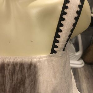 Cute tan layered top with black edging. Peephole closure in back. Approx measurements are p2p 17”, length 22”. NWOT