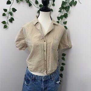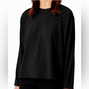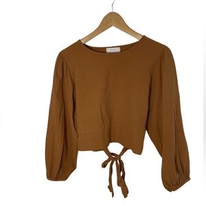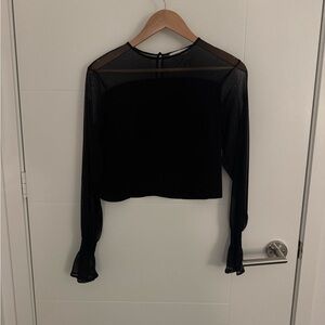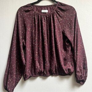 Flowy dark blouse with a pretty white and tan floral pattern. It has long sleeves with elastic cuffs and an elasticated neckline and hem. Super comfy and light.