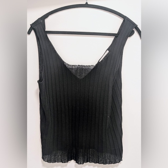 Oak + Fort Chic black ribbed tank top. Ideal for layering or solo. Sheer, partially see-through, lightweight fabric.