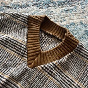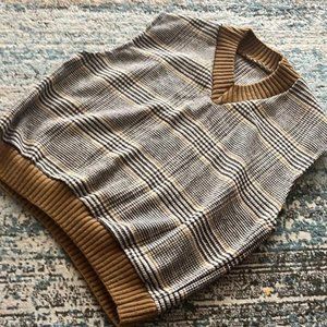 Stylish plaid sweater vest. Features brown ribbed trim. Perfect for layering.