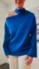 Design Details: It features an off-the-shoulder neckline on one side that drapes into a mock neck collar on the other, creating an asymmetric or skewed look. It has long, relaxed, or dolman-style sleeves.