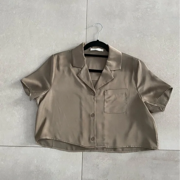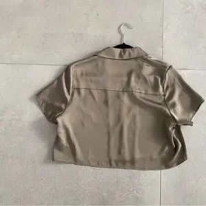 Pretty blouse, short sleeves. Silky and comfy, very fashionable. Great taupe colour, sized small. Made of 100% Polyester.
