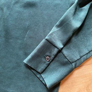 Sleek forest green button-up satin shirt from OAK + FORT. The color in the image with the material tag is the most color-accurate. Slight pilling in some areas.