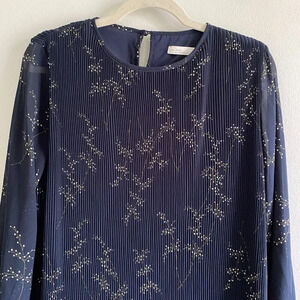 OAK + Fort Blue and White Pleated Long Sleeve Floral Shift Dress Size S