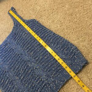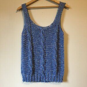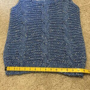 Good preowned condition, handmade, cable knit, periwinkle blue, sleeveless top with bits of white yarn woven in throughout. It's not perfect, but it's got 'that look' going for it.