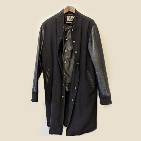 Stunning design from former OAK NYC. Inlay leather jacket at the front added to a varsity-like long coat with leather sleeves.