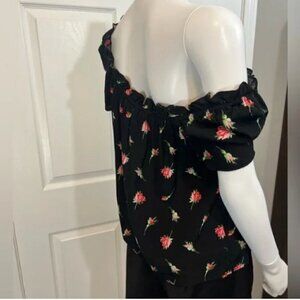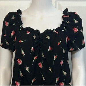 This beautiful cropped blouse is black with roses printed throughout and has a scoop elastic ruffled neckline.