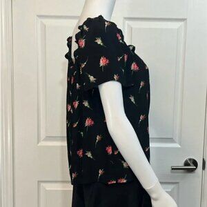 Gorgeous short sleeve elastic ruffled neckline top. Black floral. SZ 12
