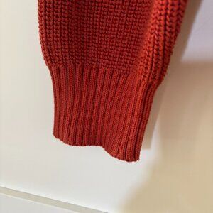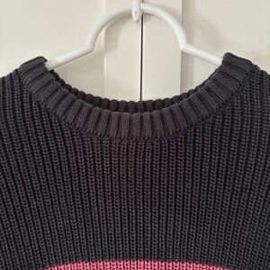 Beautiful knit with charcoal gray, pink and orange stripes.