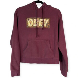 OBEY Wine Cropped Graphic Logo Sweatshirt Hoodie with Kangaroo Pocket Baddie M