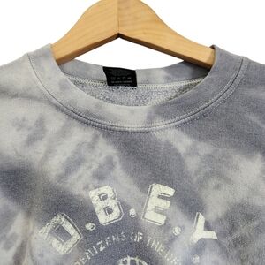 OBEY, pull-on, blue and white tye dyed, long-sleeve sweater. Crew-neck, stretchy elastic cuffs, waistband and neck. Super comfortable, stretchy lightweight but warm sweater in good condition size S