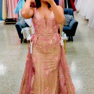 Beautiful 2 piece formal floor length mermaid dress in pink. It is size 10 US. Included is the dress, as well as a detachable overlay skirt. This dress is absolutely GORGEOUS!! I am so in love with it, I bought it last year from an Italian boutique called Palazzo Moda for 749.99 before tax. Only worn once to a formal gathering. Still in mint condition and recently dry-cleaned. The price is negotiable. This is a one of a kind dress, you will not find it anywhere else. Please send me a message if you have any questions.