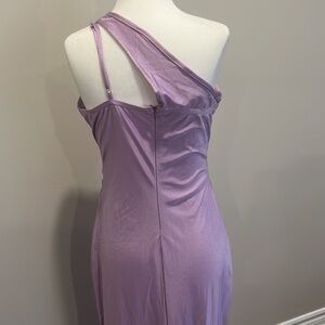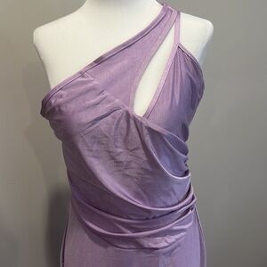 Step out in this modern full-length gown, designed with an asymmetrical, cut out cowl neckline that reveals the shoulder. A floor-skimming mermaid skirt with a slight train lends movement and a dramatic sheen to the luxe stretch satin fabric. Back zipper.