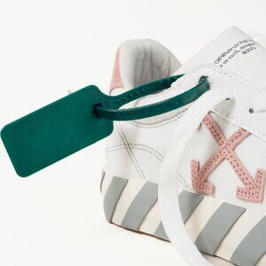 Expertly crafted with a cotton canvas and leather upper, these OFF-WHITE Low Vulcanized Canvas Sneakers elevate your daily look. The diagonal striped rubber sole and signature arrow motif patch add a unique touch, while the contrast zip tie and tag detail provide practicality. Enjoy all-day comfort with the lace-up closure and round toe design. Imported and ready to make a statement.
