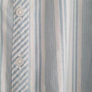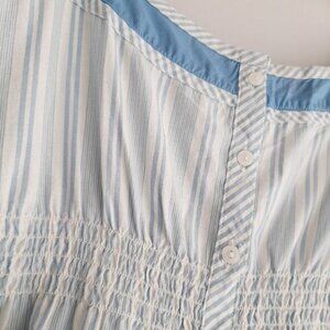 • Spaghetti strap button down nightgown / pajama dress in white with blue stripe pattern and elastic babydoll smocking detail.