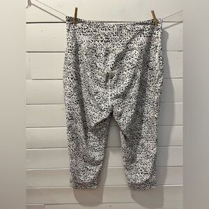 Comfortable and stylish cropped joggers in black and white abstract print. Features a high, wide waistband for support and a soft, stretchy feel perfect for workouts or lounging. Capri length. Size XXL.