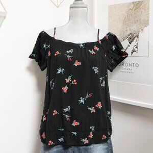 Pretty black breezy blouse with spaghetti straps that can be worn off the shoulder or on like a boatneck style t shirt top. Croceht detail on the sleeve cuffs. Loose flowy fit. 100% rayon, made in Indonesia