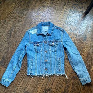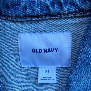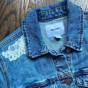 OLD NAVY DENIM DISTRESSED/LACE APPLIQUE. DENIM JACKET SIZE XS