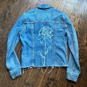 Distressed at hem for updated look. and desighn of a rose on back with small applique on shoulder,, size xs