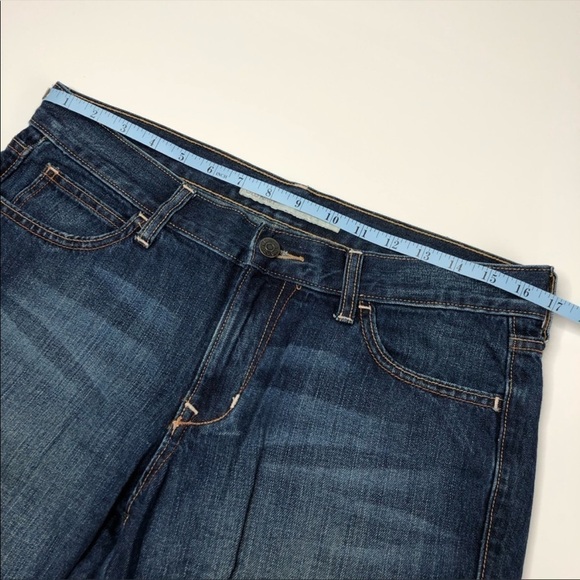 Old Navy dark blue denim jean bermuda shorts with a distressed raw hem and white washed legs. There is no stretch to them (they are 100% cotton). The first photo is the best representation of its color. They are in excellent used condition with no flaws. Only worn once. Please see photos for measurements and details. Women’s size 8.