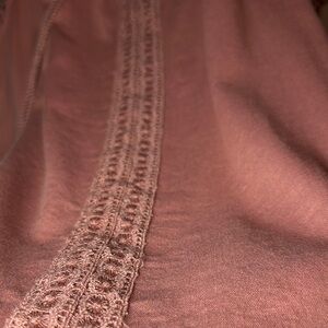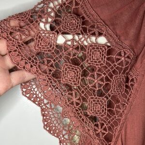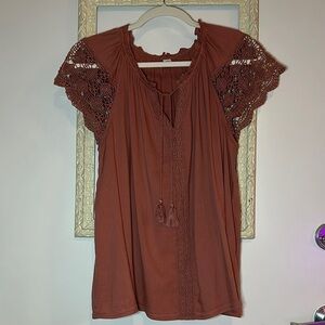 Elevate your style with this elegant women's top featuring intricate lace sleeves. The rich rust color adds a warm touch to any outfit. Perfect for both casual and dressy occasions.