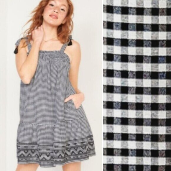 OLD NAVY | Tiered Gingham Swing Mini Dress w Pockets Babydoll Checkered B&W L P