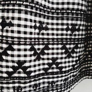 • Babydoll style dress in black and white check gingham pattern with tassel end shoulder ties and embroidered hem..