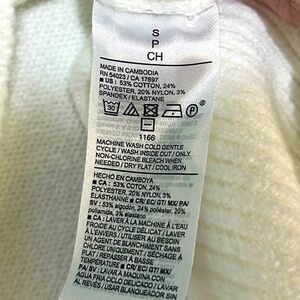 This has only been worn a few times since I’m always nervous about getting white clothing dirty. The sweater is in good condition and is made of a Poly-cotton blend fabric and some recycled materials.