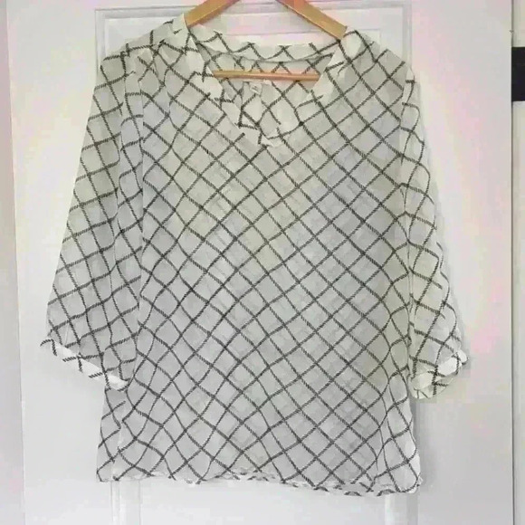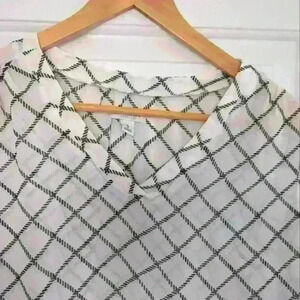 • Style: pullover, sheer, checkered chain pattern, v-neck, 3/4 length sleeves, relaxed fit