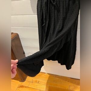 Soft black wrap dress with subtle dotted texture. Elastic waistband, short puffed sleeves, and tie closure. Light and flowy fabric, perfect for layering or summer days. In excellent condition.