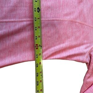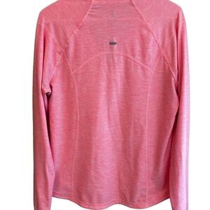 In excellent pre-owned condition, long sleeve, partial front zip, soft pink, some stretch, size large, slim fitting. See measurements. No hoodie. Has thumbholes.
