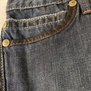 Like new. Old Navy Special Edition denim skirt in dark wash with faux leather detailing on pockets and frayed denim at hem. Dark wash.
