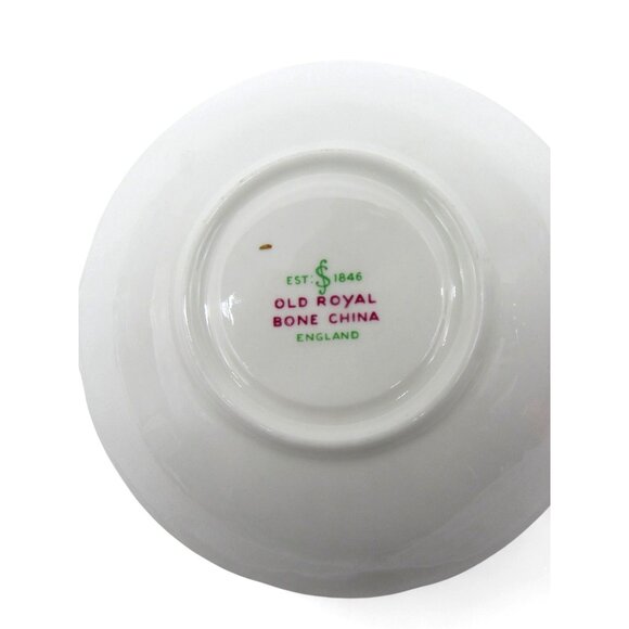 This charming tea cup and saucer set from Old Royal Bone China, established in 1846, is adorned with a delicate blue rose pattern that evokes a sense of timeless elegance.