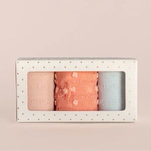 A beautiful ribbon trio. Carefully hand-dyed, hand-cut and hand-frayed in Canada, these ribbons are thoughtfully crafted to be the most opulent ribbons imaginable. Use them to wrap gifts, as a hair accessory or to beautifully drape a banister or tree for the holidays!