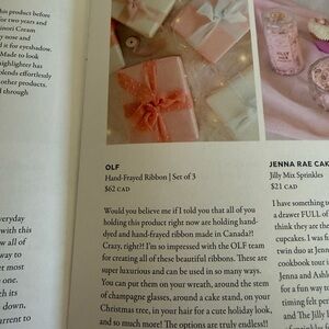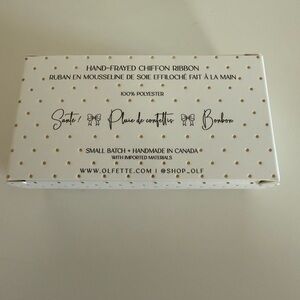OLF trio of luxe hand-frayed chiffon ribbon hand made in Canada. Featured in Winter 2024 Jilly Box. Each ribbon is 0.13 FT (0.004m) by 9.8 FT (3m). Brand New in original box.