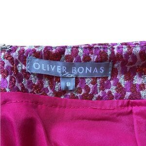 Excellent pre-owned condition, size 8, cheetah print in pinks, reds, silver metallic fabric. Pockets in front, zipper at centre back. See measurements. 18 inches long.
