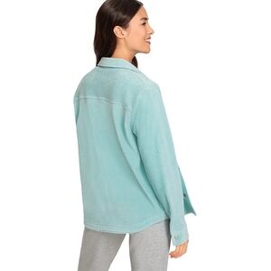 This tailored style combines the look of a shirt and warmth of a jacket. A velvety hand with generous stretch as the broad wale structure really gives it body and the cozy factor. Features a turned down collar, snap button front closure, and cuffs.