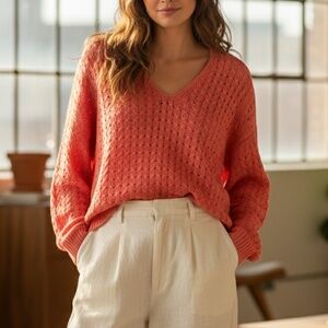 OLSEN watermelon pink open knit v neck boxy pullover cable knit sweater XL / 16
