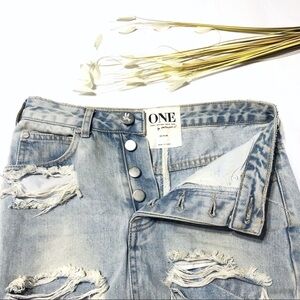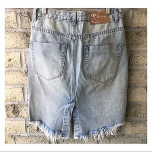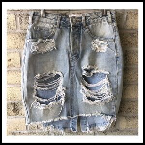 Effortless & cool this high waisted pencil skirt is a guaranteed statement piece • EUC • Long rise • Mid-length • Super fitted • Light wash • Curved raw hem • Heavy distressed detail • Back slit • Button fly + 5 pocket style • Belt loops • 100% Cotton