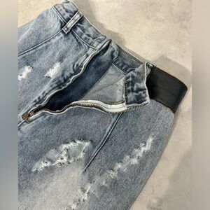 Light wash distressed fitted denim skirt. Exposed zipper closure. Perfect for spring and d summer. Festival wear!