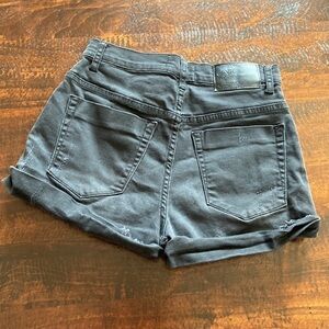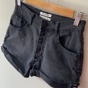Super cute black cut-off Harlets shorts by One Teaspoon. High rise with an exposed button fly. Light fading and distressing throughout. Twisted raw hem. Stretch denim. Classic 5-pocket style.